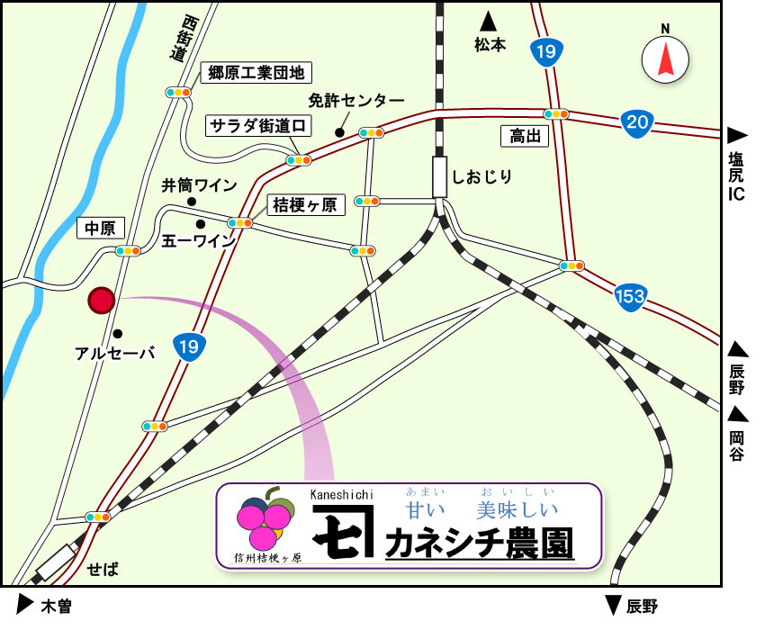 ここを木曽方面(南)に250mほど進むと、右手に当農園があります。 (TEL:0263-53-2618)